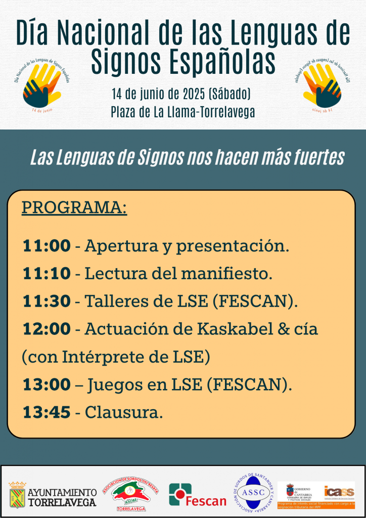 El Día Nacional de las Lenguas de Signos Españolas se celebra este año bajo el lema «Las Lenguas de Signos nos hacen más fuertes«. Las Asociación de Sordos del Besaya (ASOBE) y la Federación de Asociaciones de Personas Sordas de Cantabria (FESCAN) han organizado un programa de actividades que tendrá lugar en la Plaza de la llama de Torrelavega de 11:00 de la mañana a 13:45 de la tarde.