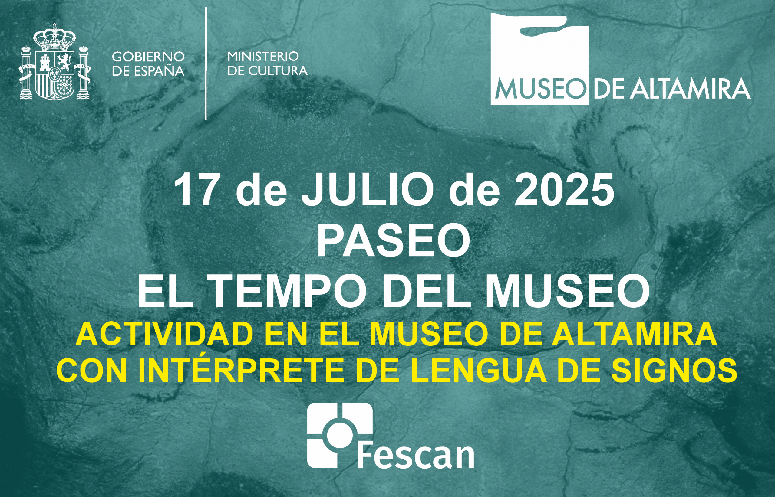17Jul12:0012:00 PASEO EL TEMPO DEL MUSEOACTIVIDAD EN EL MUSEO DE ALTAMIRA CON INTÉRPRETE DE LENGUA DE SIGNOSMUSEO DE ALTAMIRA, Avenida Marcelino Sanz de Sautuola, s/n, 39330 Santillana del Mar, CantabriaTipo de eventoActividades