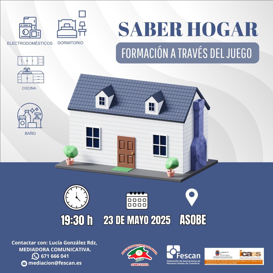 23May19:3019:30 TALLER "SABER HOGAR: FORMACIÓN A TRAVÉS DEL JUEGO"ASOBE. ASOCIACIÓN DE SORDOS DEL BESAYA, Calle Ansar, s/n, Torrelavega (Cantabria)Tipo de eventoTalleres