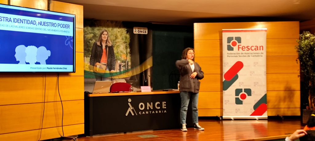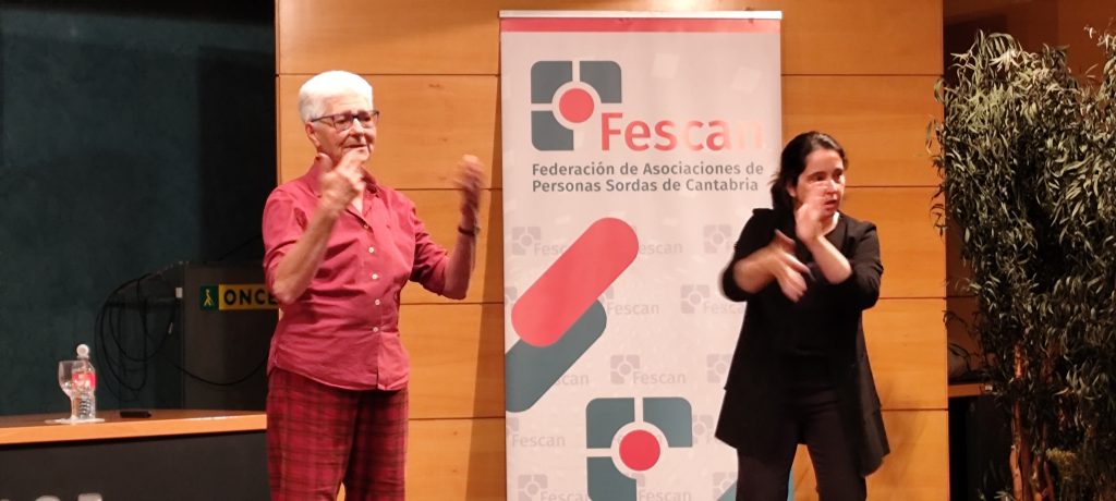 El pasado sábado 8 de noviembre, la Federación de Asociaciones de Personas Sordas de Cantabria, FESCAN, organizó la jornada «Mujer sorda y participación social: Tiempo de cambio«, en la que se habló sobre historia del feminismo y el papel de la mujer sorda en el desarrrollo del mismo. También se abordó el tema de la discapacidad como inspiración social, sus pros y contras, y se finalizó con un debate sobre algunos extractos de la película «Sorda».